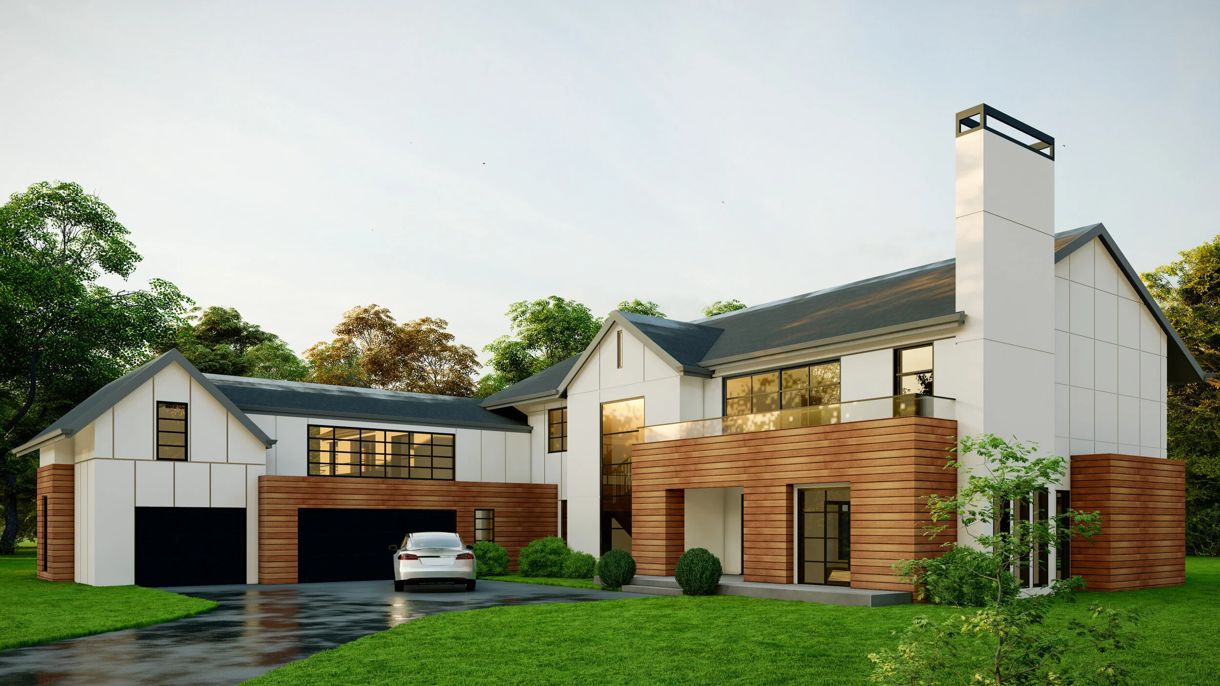 Large modern house with gray siding and brick accents, multiple roofs, a curved driveway with a small landscaped island, and green lawn.